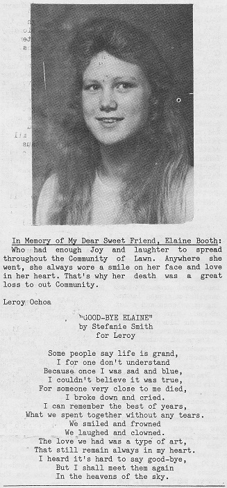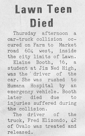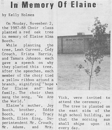 Elaine Alma Booth, daughter of Clyde Edward Booth and Joy Lynn Stevens was born May 3, 1971, died October 15, 1987 in an automobile accident and buried in Tuscola Cemetery, Tuscola, Taylor County, Texas.