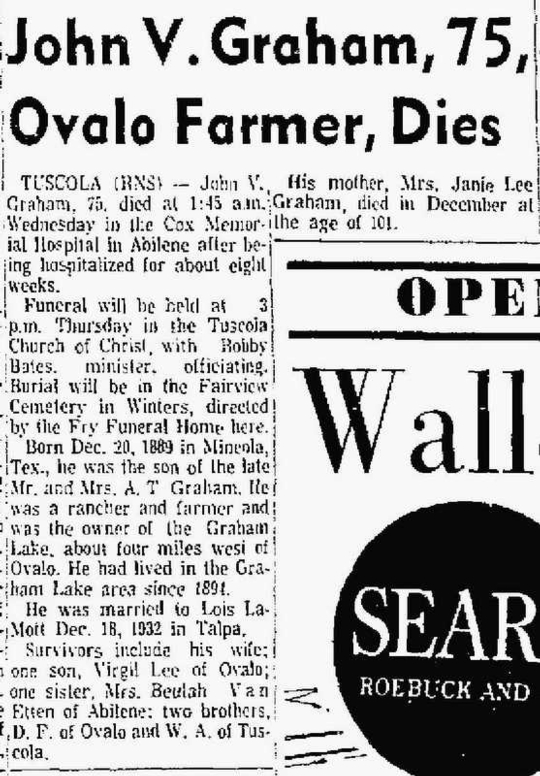 Johnnie Virgil 'J.V.' Graham, son of Alfred Thomas Graham and Janie Lee Schuber, married to Lois Blanche (Watkins) Lamotte and buried in Fairview Cemetery, Winters, Runnels County, Texas.