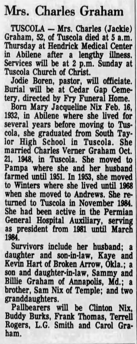 Jackie, daughter of Aaron Jackson Nix and Juanita Christine Bacon, married to Charles Verner Graham and buried in Cedar Gap Cemetery, Tuscola, Taylor County, Texas.