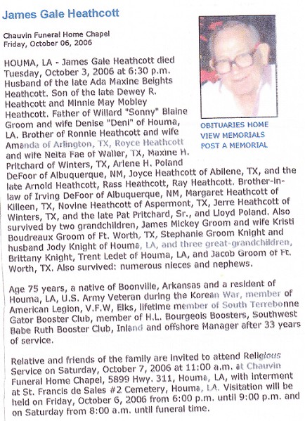 Jimmy, son Dewey Richard Heathcott and Minnie May Mobley, married to Ada Maxine Beights and buried in St. Francis de Sales #2 Cemetery, Houma, Terrebonne Parish, Louisiana.