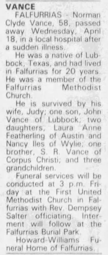 Norman, son of  John Ruskin Vance and Frankie Eulalah Rogers, married to Julien Downing and buried in Falfurrias Burial Park Cemetery, Falfurrias, Brooks County, Texas.