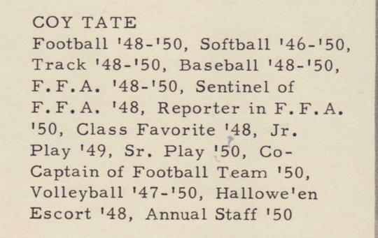Coy graduated from McMurray College and served in the US Marine Corp. Later, he worked in Abilene and owned Taylor County Ford Tractor.
