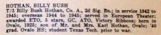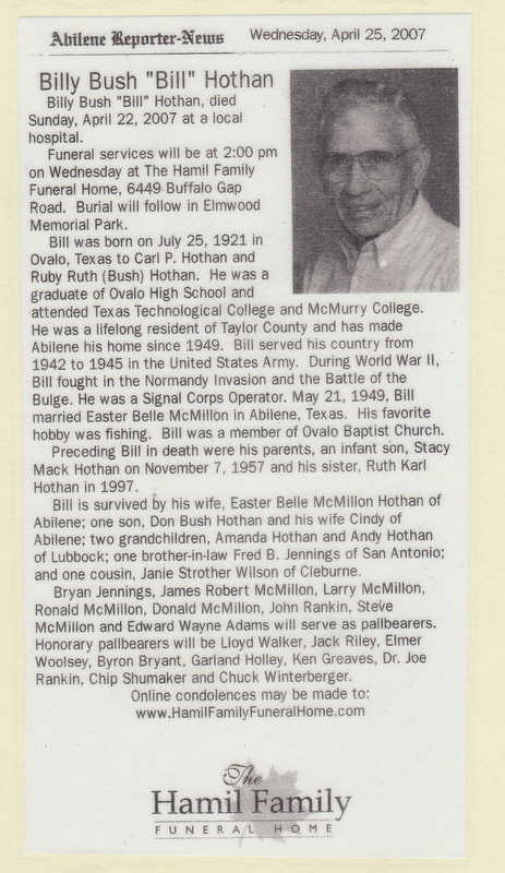 Billy, son of Carl Phillip Hothan and Ruby Ruth Bush, married to Easter Belle McMillon and buried in Elmwood Memorial Park Cemetery, Abilene, Taylor County, Texas.