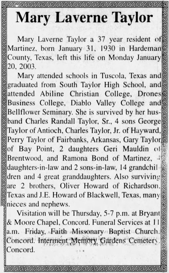 Mary Laverne Taylor a 37 year resident of Martinez. Born January 31, 1930 in Hardeman County, TX., she left this life on Monday, January 20, 2003. Mary attended schools in Tuscola, TX and graduated from South Taylor High School, and attended Abiline Christian College, Drones Business College, Diablo Valley College, and Bellflower Seminary.