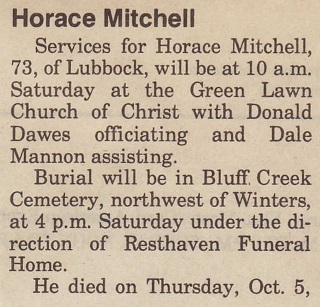 Horace, son of James Elliott Mitchell and Bertha Mae Davis, married to Billie Jean Walker and buried in Bluff Creek Cemetery, Taylor County, Texas.