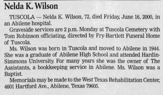 Nelda, daughter of P.W. Wilson and Lillian Kathleen Hafner, married to Augustus J. Callahan and buried in Tuscola Cemetery, Tuscola, Taylor County, Texas.