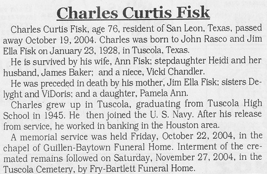 Charles, son of John Roscoe Fisk and Jim Ella Casey, married to Patricia Ann Browning and buried in Tuscola Cemetery, Tuscola, Taylor County, Texas.