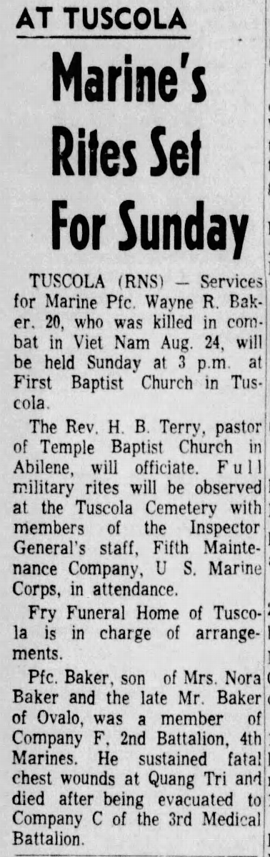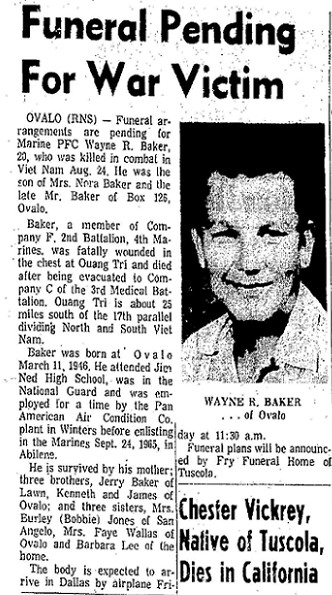 Baker was born at Ovalo March 11, 1946. He attended Jim Ned High School, was in the National Guard and was employed for a time by the Pan American Air Condition Co. plant in Winters before enlisting in the Marines Sept. 24, 1965, in Abilene.