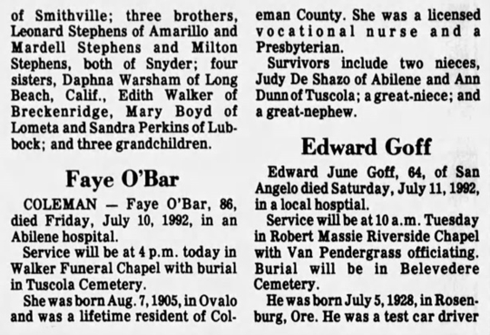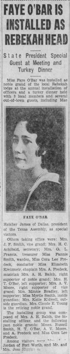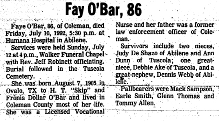 Faye, daughter of Henry Theolar O'Bar and Fronia Etta Dollar and buried in Tuscola Cemetery, Tuscola, Taylor County, Texas.