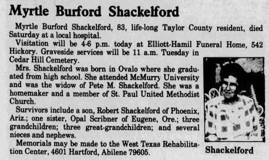 Myrtle, daughter of Tolbert Alexander Burford and Margaret Maggie Fisher, married to Peter Milo Shackelford and buried in Abilene Municipal Cemetery, Abilene, Taylor County, Texas.