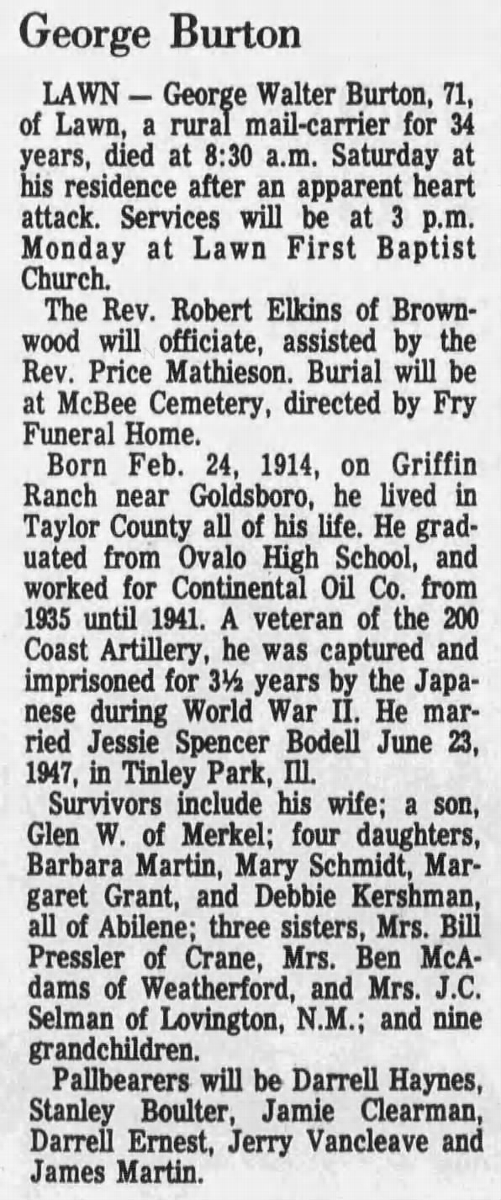 George, son of George Walter Burton, Sr. and Mary Wilma Parnell, married to Jessie Spencer Bodell and buried in McBee Cemetery, Ovalo, Taylor County, Texas.