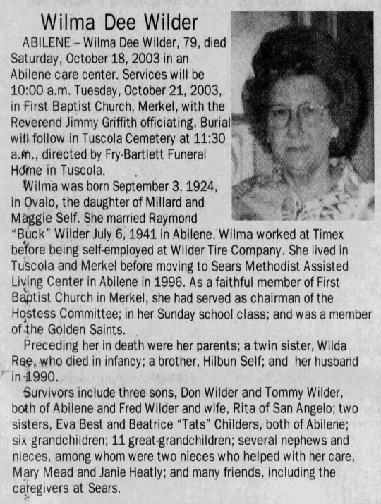 Wilma, daughter of Millard Fillmore Self and Margaret Jane 'Maggie' Coley, wife of Raymond R.O. 'Buck' Wilder and buried in Tuscola Cemetery, Tuscola, Taylor County, Texas.