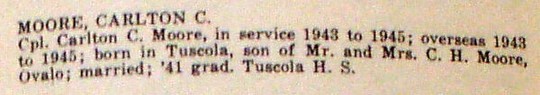 Carlton Casey Moore, 79, died Sunday, January 5, 2003, in an Abilene hospital. Services will be 10 a.m. Wednesday, January 8, 2003, in North Park Baptist Church, with the Reverend Louis Johnson officiating. Burial will be in Tuscola Cemetery, directed by Fry-Bartlett Funeral Home in Tuscola.