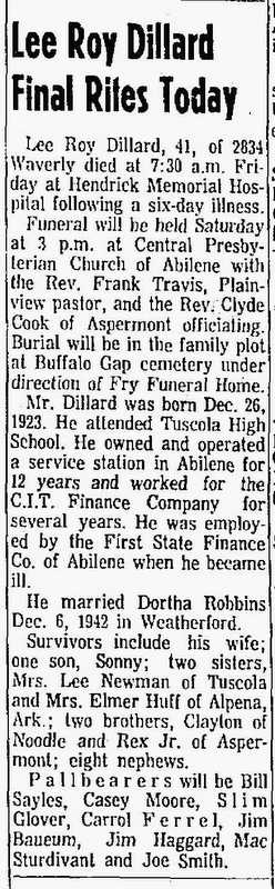 Lee Roy, son of Rector Edwin Dillard and Maggie Bell Gaither, married Dortha Lucille Robbins and buried in Buffalo Gap Cemetery, Buffalo Gap, Taylor County, Texas.