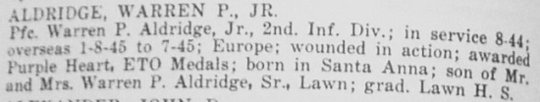 Warren was born May 2, 1926 in Lawn, TX. to Warren Presley Aldridge, Sr. and Mary Beulah (Vanderford) Aldridge. He was married to Marion Elizabeth Guess on August 3, 1945 in Wingate, TX. He took great pride in the fact he was a WWII US Army veteran, having received the Purple Heart and 3 Bronze Stars while serving in Germany and Belgium.
