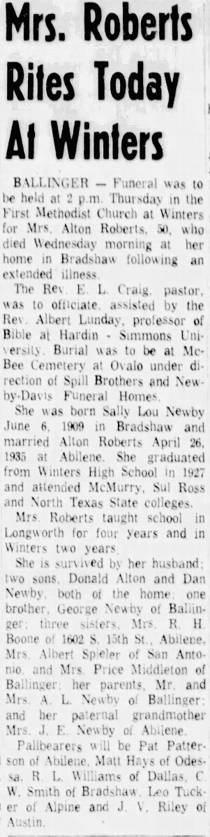 Mrs. Alton Roberts, 50, died at 9:10 a. m. Wednesday at her ranch home near Bradshaw, following an extended illness. Born Sally Lou Newby June 6, 1909 at Bradshaw where she spent her early childhood, she graduated from Winters High School in 1927 and attended McMurry, Sul Ross and North Texas State Colleges.