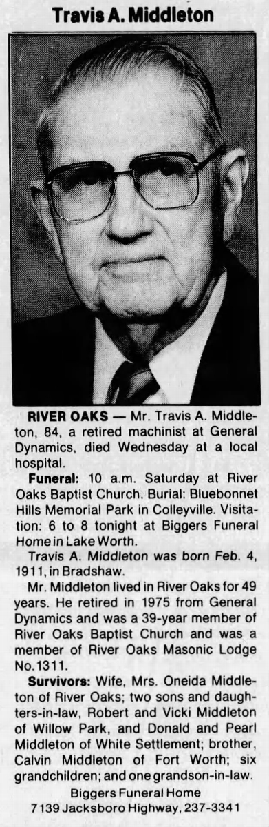 Travis, son of Rollie Andrew Middleton and Hettie Erene Cloud, married 1st to Loyce Ruth Billingsley, married 2nd to Oneida Surratt and buried in Bluebonnet Hills Memorial Park Cemetery, Colleyville, Tarrant County, Texas.