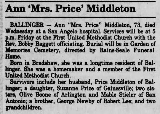 Ann, daughter of Arthur Lee Newby and Myrtle Lee Fisher, married to Joseph Thomas Price Middleton and buried in Garden of Memories Cemetery, Ballinger, Runnels County, Texas.