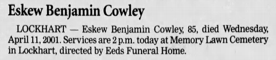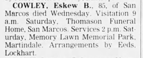 Eskew, son of George Rufus Cowley and Frances Jane 'Jenny' Bailey, married to Leona Ermine Inman and buried in Memory Lawn Memorial Park Cemetery, Martindale, Caldwell County, Texas.