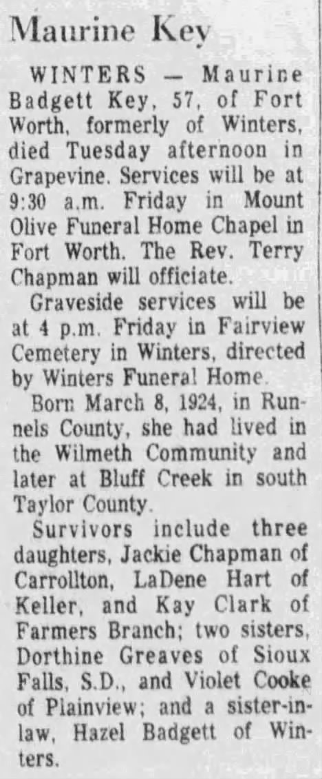 Maurine, daughter of Ross Freemon Badgett and Nancy Barshahe Fuller and buried in Fairview Cemetery, Winters, Runnels County, Texas.