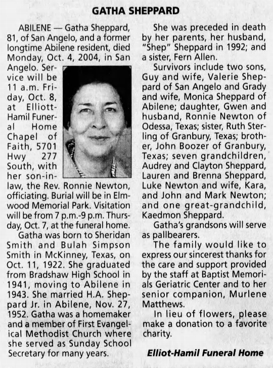 Gatha, daughter of Sheidan Smith and Beulah B. Simpson, married to Henry Alvin Sheppard, Jr. and buried in Elmwood Memorial Park Cemetery, Abilene, Taylor County, Texas.