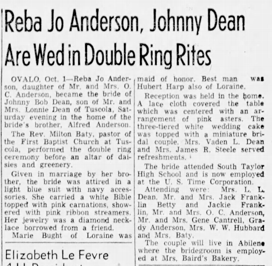 Rebba, daughter of Olie C. Anderson and Thetta Ola Cantrell, married to Johnny Bob Dean and buried in Tuscola Cemetery, Tuscola, Taylor County, Texas.