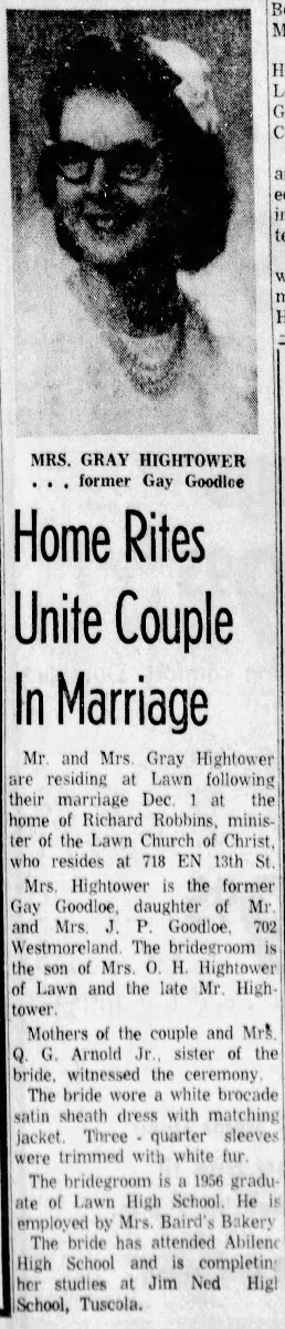 Gay, daughter of John Prentice Goodloe and Sally Prudence Jones, married to Troy Allen Hightower and buried in Oakwood Cemetery, Cisco, Eastland County, Texas.