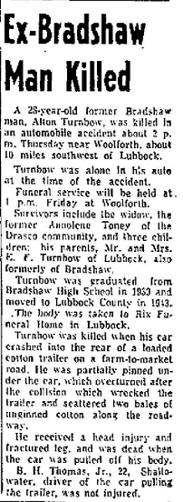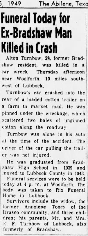 Alton, son of Elijah Francis Turnbow and Nora Zella McMillon, married to Annolene Toney and buried in Resthaven Memorial Park Cemetery, Lubbock, Lubbock County, Texas.