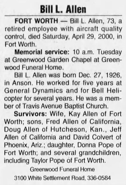 Bill, son of Fred Felston Allen and Maggie Elaine Dean, married 1st to Betty Ann Nielsen and married 2nd to Kay Rebecca Miller.