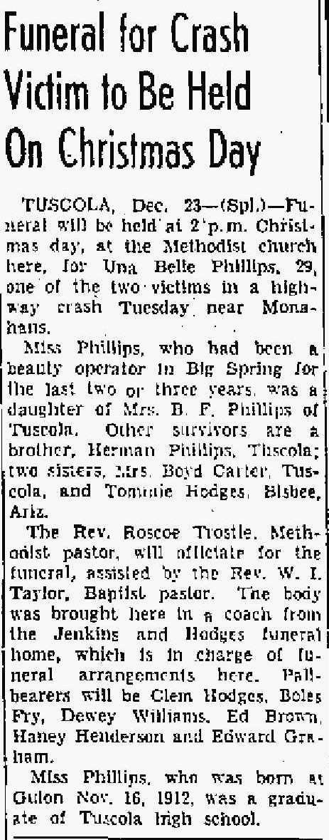 TUSCOLA, Dec. 23-(Spl.)-Funeral will be held at 2 p.m. Christmas day, at the Methodist church here for Una Belle Phillips, 29, one of the two victims in a highway crash Tuesday near Monahans.