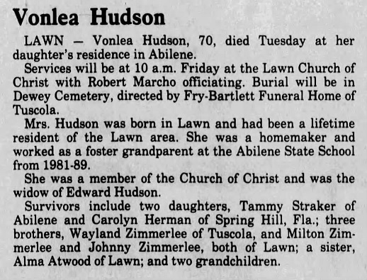 Vonlea, daughter of Oscar Zimmerle and Ella Lillian Norris, married to Edward Francis Hudson and buried in Dewey Cemetery, Lawn, Taylor County, Texas.