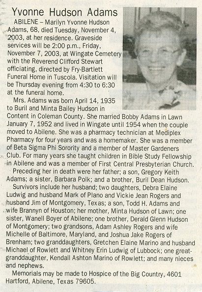 Yvonne, daughter of Buril Efran Hudson and Laura Minta Bailey, married to Bobby Gene Adams and buried in Wingate Cemetery, Wingate, Runnels County, Texas.