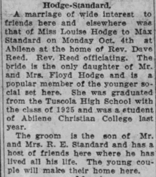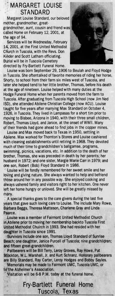 Louise, daughter of Floyd Frank Hodge and Beulah K. Knaus, married to Robert Max Standard and buried in Tuscola Cemetery, Tuscola, Taylor County, Texas.