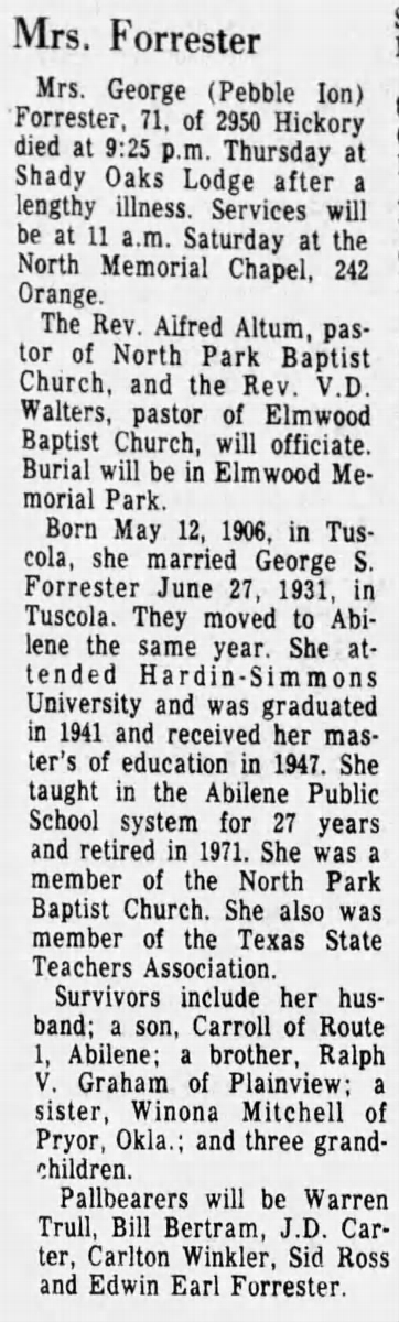 Pebble Ione Graham Forrester, daughter of Carl Graham and Celia Frances 'Frankie' Swindle, married to George Shelby Forrester and buried in Elmwood Memorial Park Cemetery, Abilene, Taylor County, Texas.