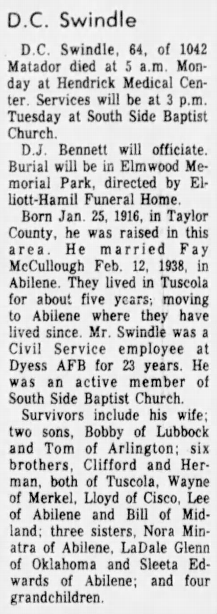 Dorman 'D.C.', son of David Cason Swindle and Ardelia Jane 'Ardie' Atkins, married to Etha Faye McCullough and buried in Elmwood Memorial Park Cemetery, Abilene, Taylor County, Texas.