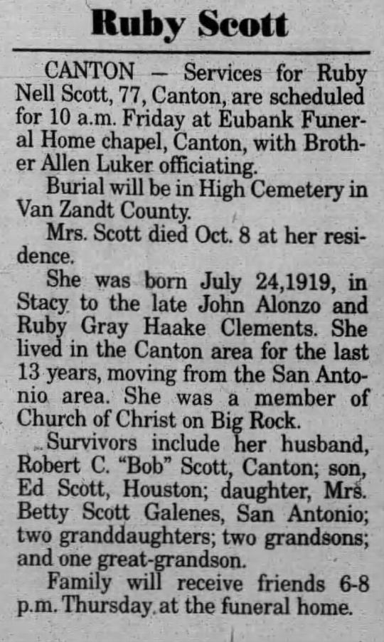 Ruby, daughter of John Alonzo Clements and Ruby Grey Haake, married Robert Cline Scott and buried in High Cemetery, Canton, Van Zandt County, Texas.